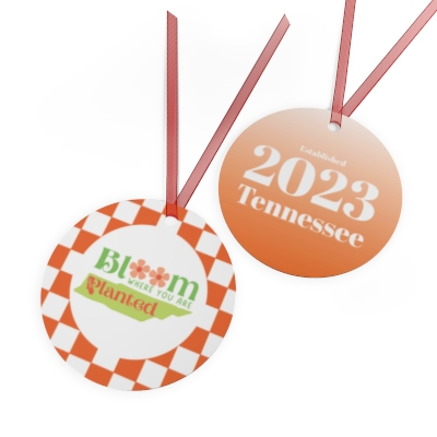 Personalized Bloom Where You Are Transplanted California to Tennessee State Shape on a Round Metal Ornaments