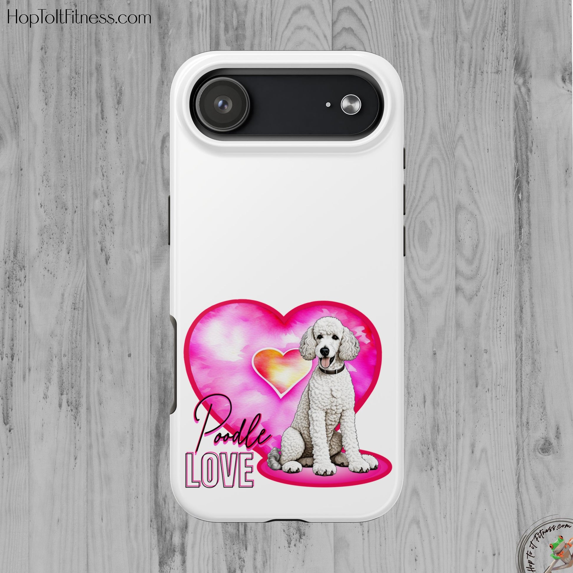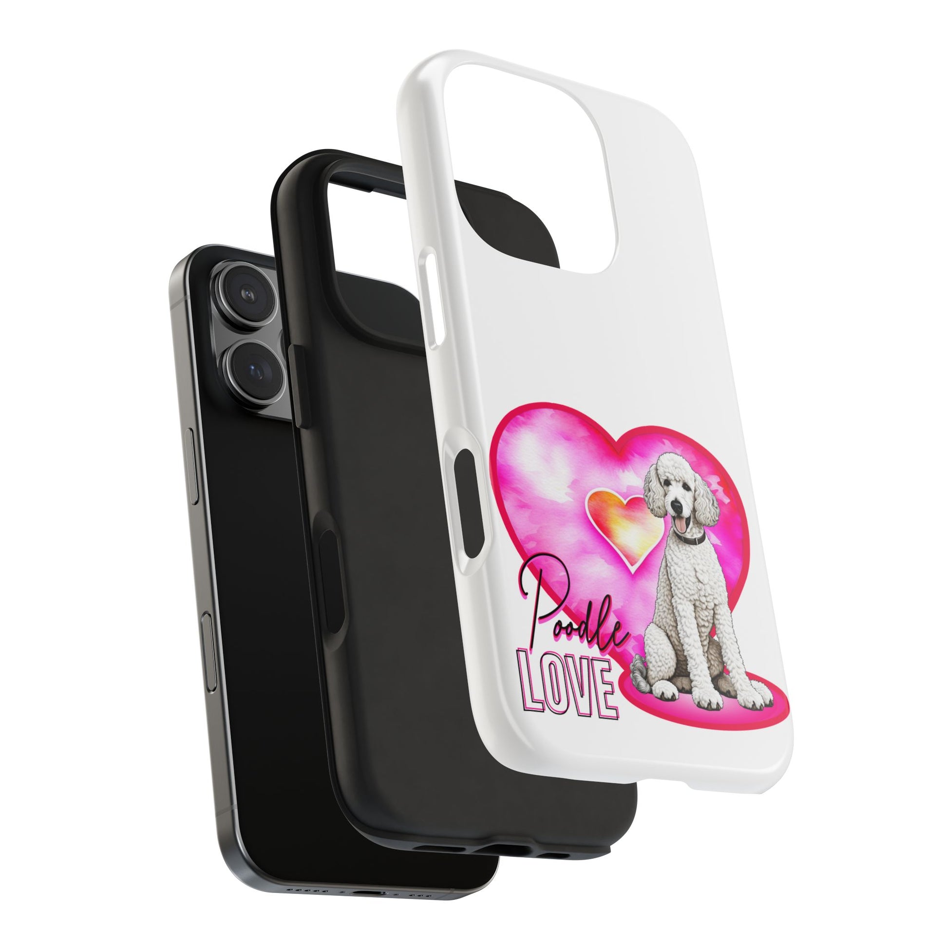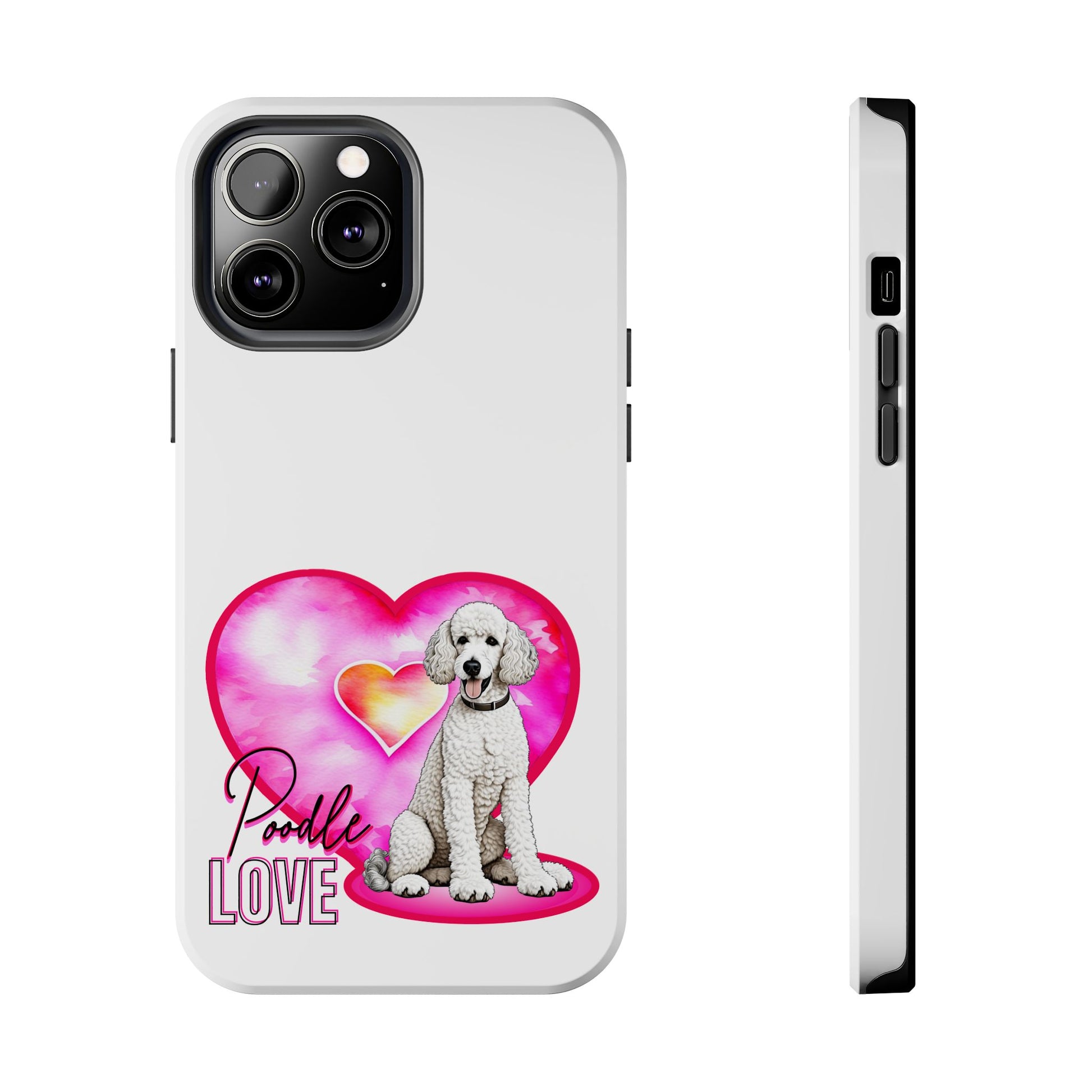 A soft-gloss phone case that wears its heart on the back — literally. This slim, two-piece case pairs a tough polycarbonate shell with a flexible TPU liner to keep your phone safe from everyday knocks. The artwork shows a sweet white poodle sitting in front of a watercolor pink heart, with scripted “Poodle Love” lettering and a vertical “LOVE” accent. It’s light in the hand, resists UV fading, and lays flat to protect the screen when placed face-down. Bring a little canine warmth to commutes, dog park visits, or quiet mornings with coffee and puppy photos.