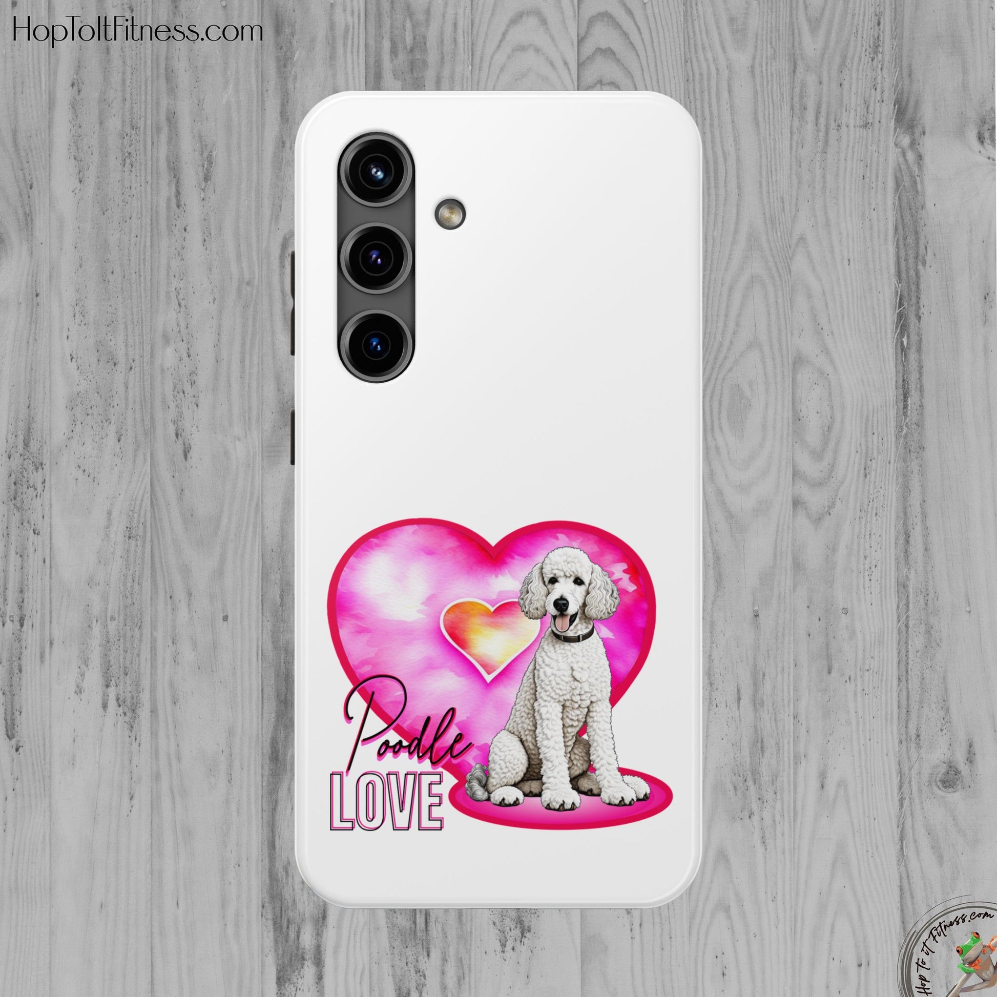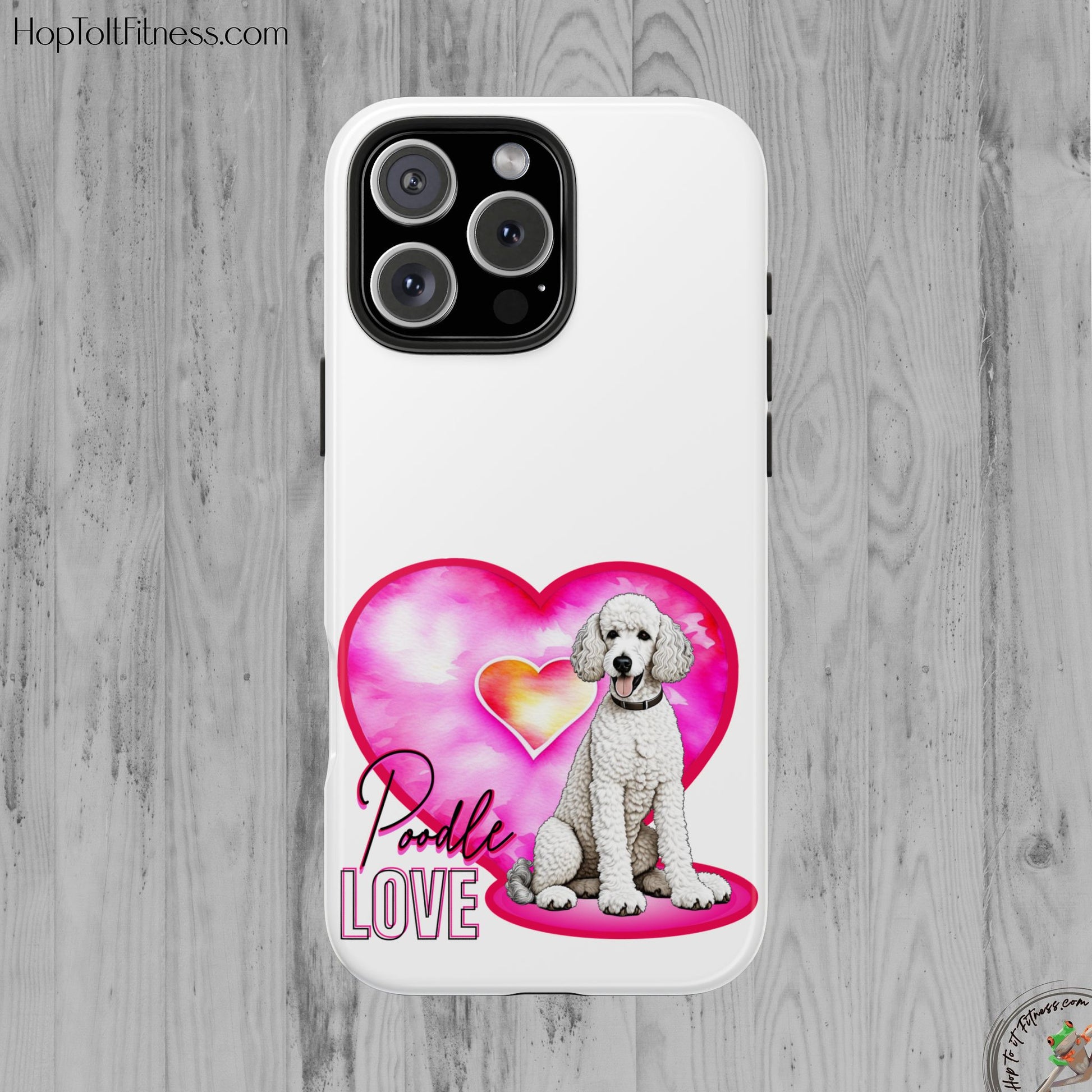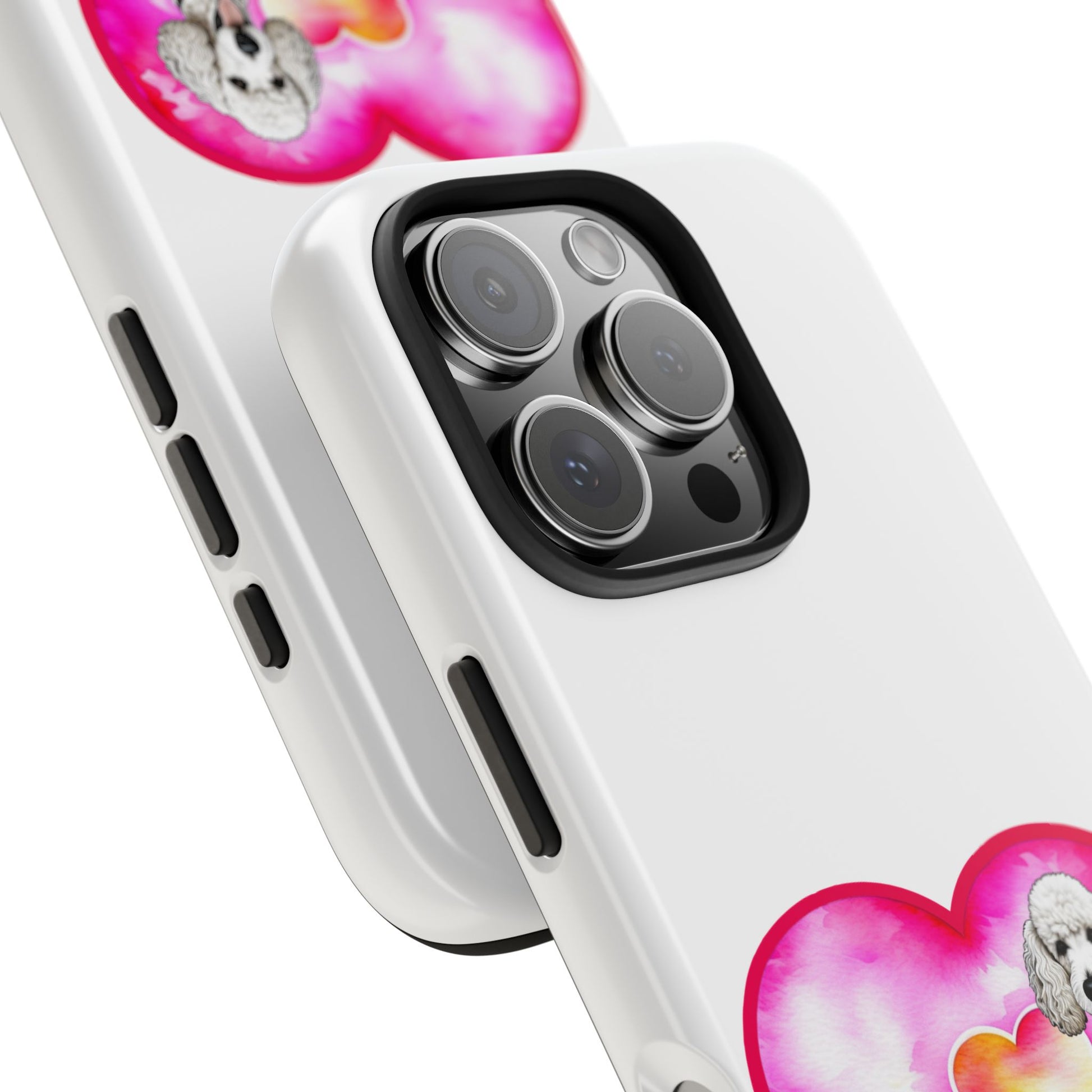 A soft-gloss phone case that wears its heart on the back — literally. This slim, two-piece case pairs a tough polycarbonate shell with a flexible TPU liner to keep your phone safe from everyday knocks. The artwork shows a sweet white poodle sitting in front of a watercolor pink heart, with scripted “Poodle Love” lettering and a vertical “LOVE” accent. It’s light in the hand, resists UV fading, and lays flat to protect the screen when placed face-down. Bring a little canine warmth to commutes, dog park visits, or quiet mornings with coffee and puppy photos.